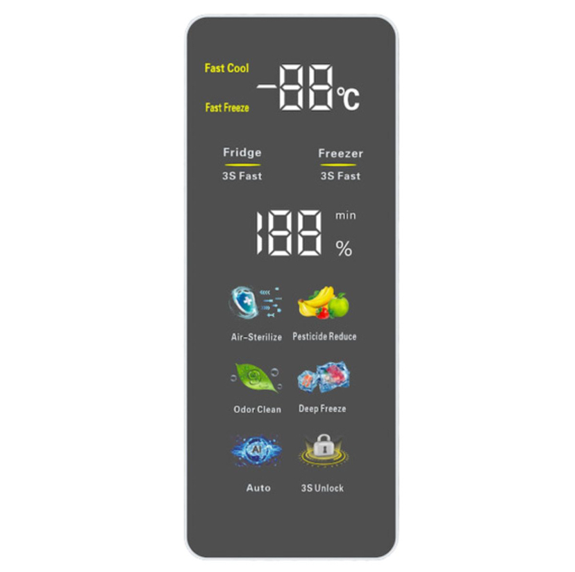 The Bruhm 510L Four-Door No Frost Inverter Refrigerator is a spacious and advanced cooling solution tailored for modern households. Boasting a 510-liter capacity, this refrigerator provides ample space for organized food storage with its innovative four-door design. Equipped with No Frost Technology, it prevents ice buildup and ensures hassle-free maintenance. The inverter technology enhances energy efficiency, delivering reliable cooling while saving on electricity costs. Its colourful touch screen display offers a sleek, intuitive interface for temperature control and monitoring, making it a perfect blend of functionality, energy efficiency, and modern aesthetics for contemporary kitchens.